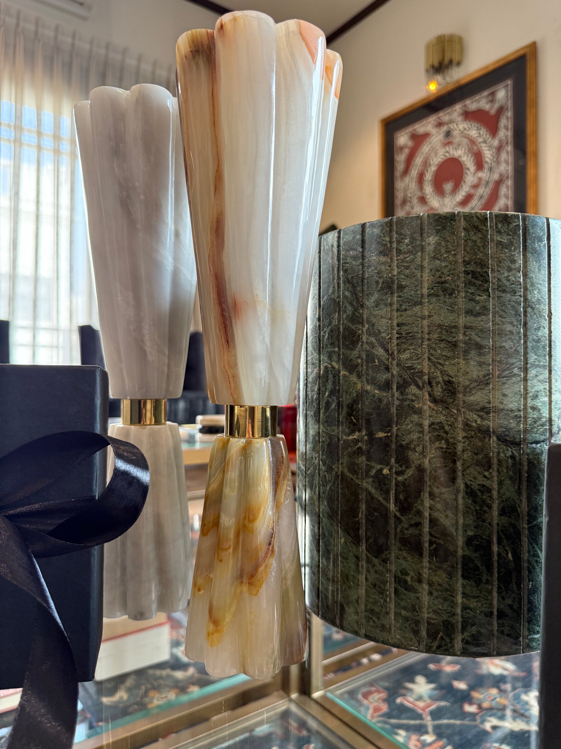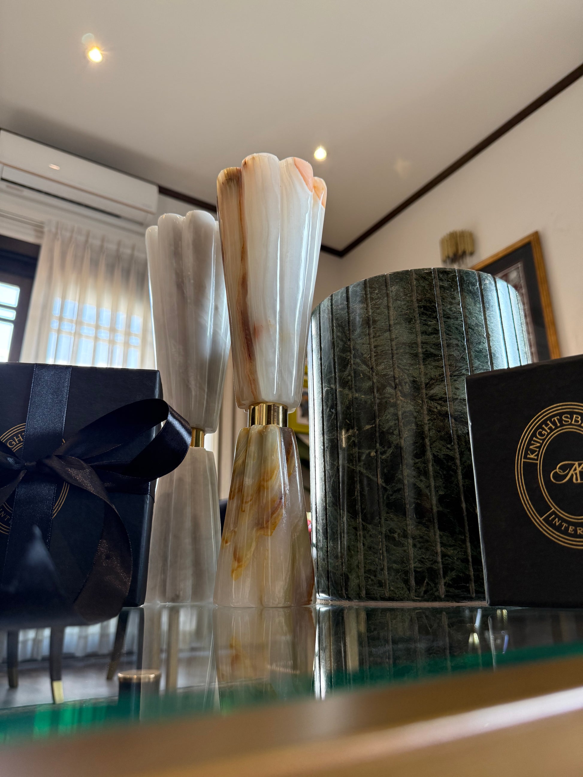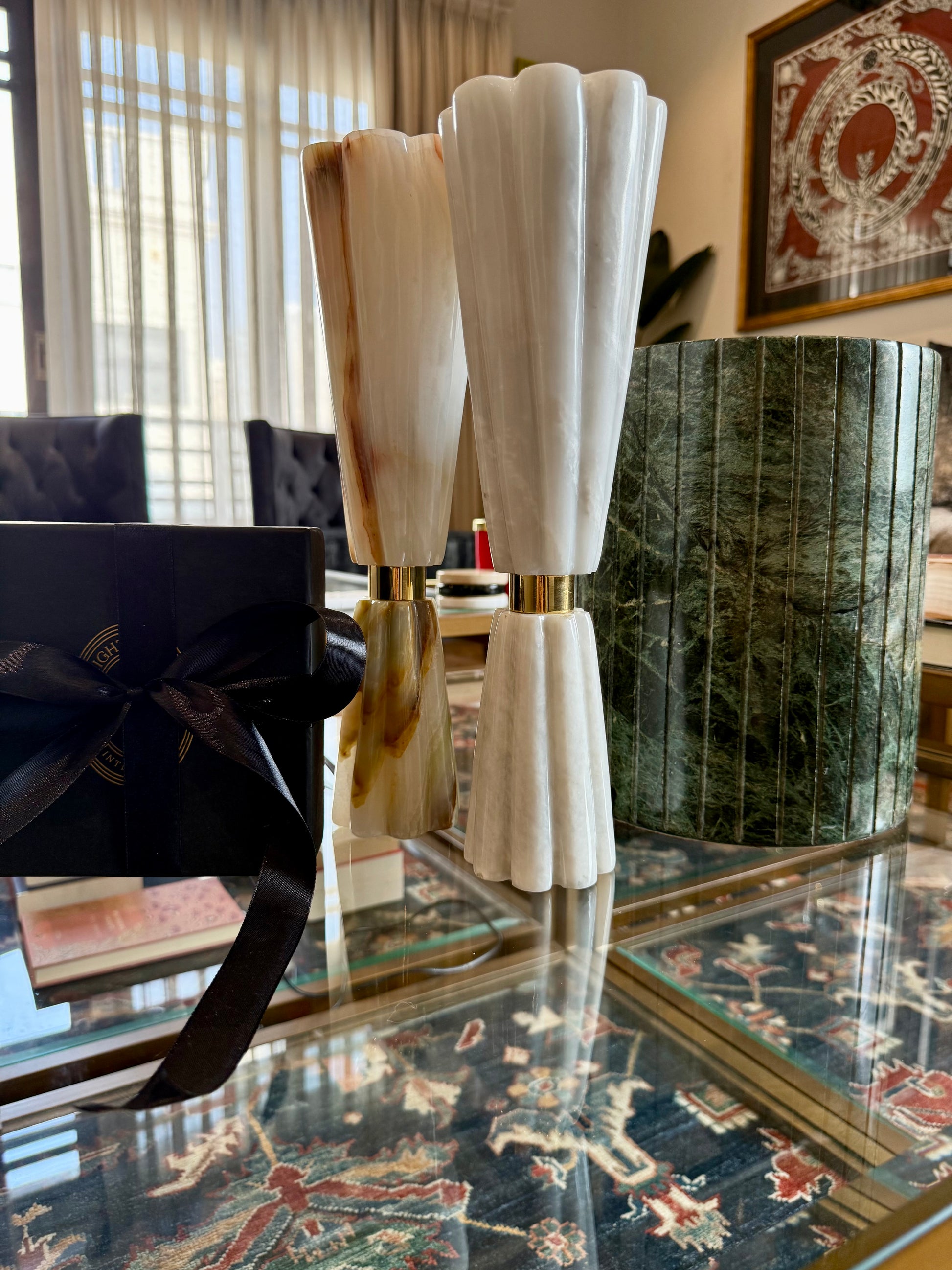 Meticulously sculpted in an elegant floral design, these lamps are crafted from premium Onyx or Ziyarat White marble, with exquisite brass accents. Radiating soft, ambient light through their delicate petals, they transform any space into a sanctuary of refinement and artistry. Packaged in our signature black box lined with satin.